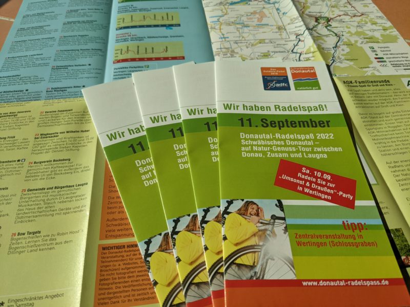 Die konkrete Planung des Radelspaß-Wochenendes kann beginnen! Der kostenlose Planer für den 13. und 14. September liegt ab Mitte August bei Sparkassen, VR-Banken und Gemeinden sowie in vielen Radgeschäften, Unternehmen, Biergärten und Gastwirtschaften in den Landkreisen Dillingen und Günzburg sowie zum Teil in den angrenzenden Landkreisen Donau-Ries, Augsburg und Heidenheim aus. Auch über einige amtliche Mitteilungsblätter der Region wird der Aktionsflyer direkt an die Haushalte verteilt.